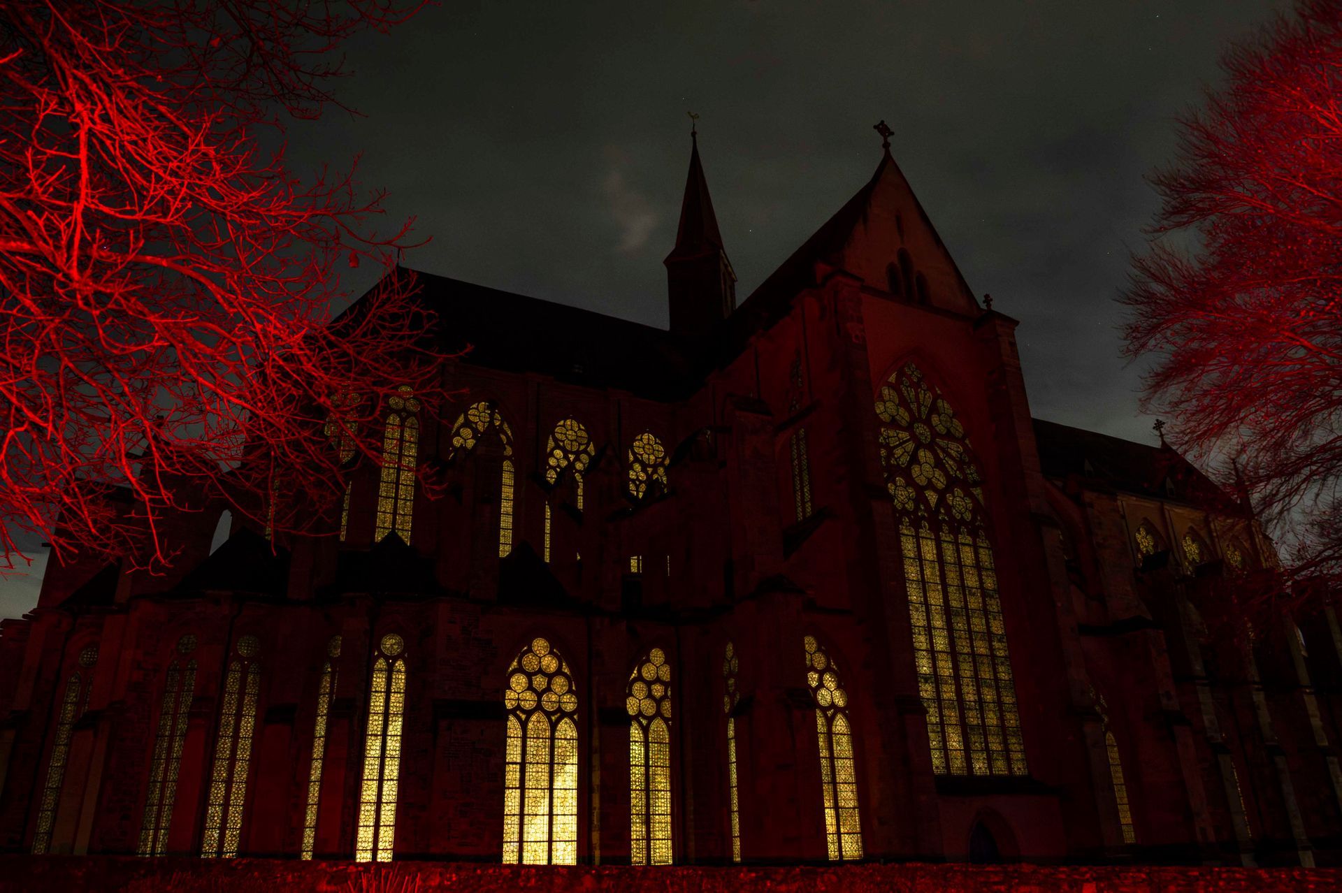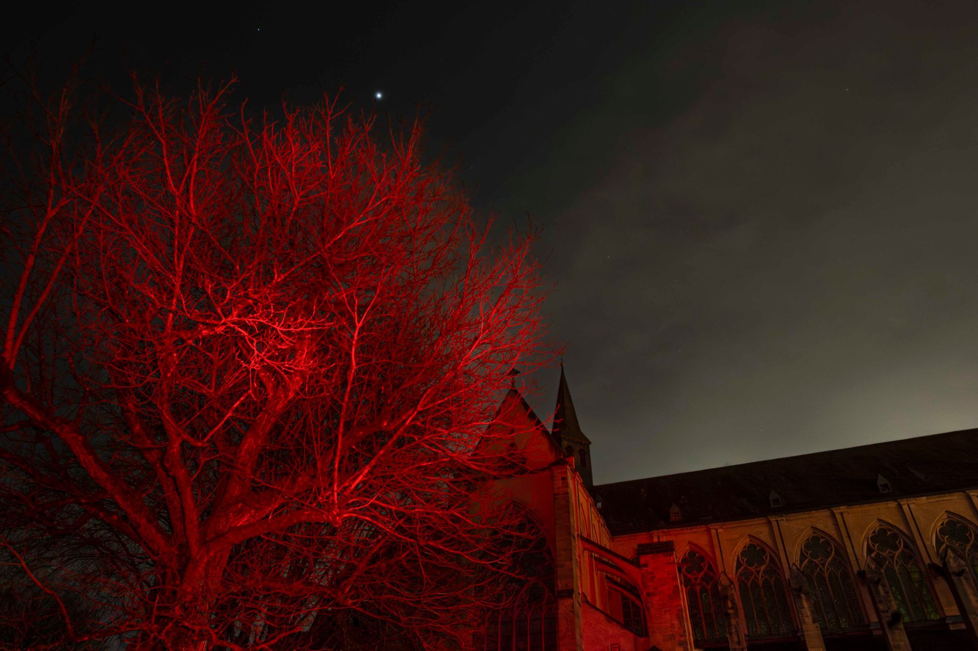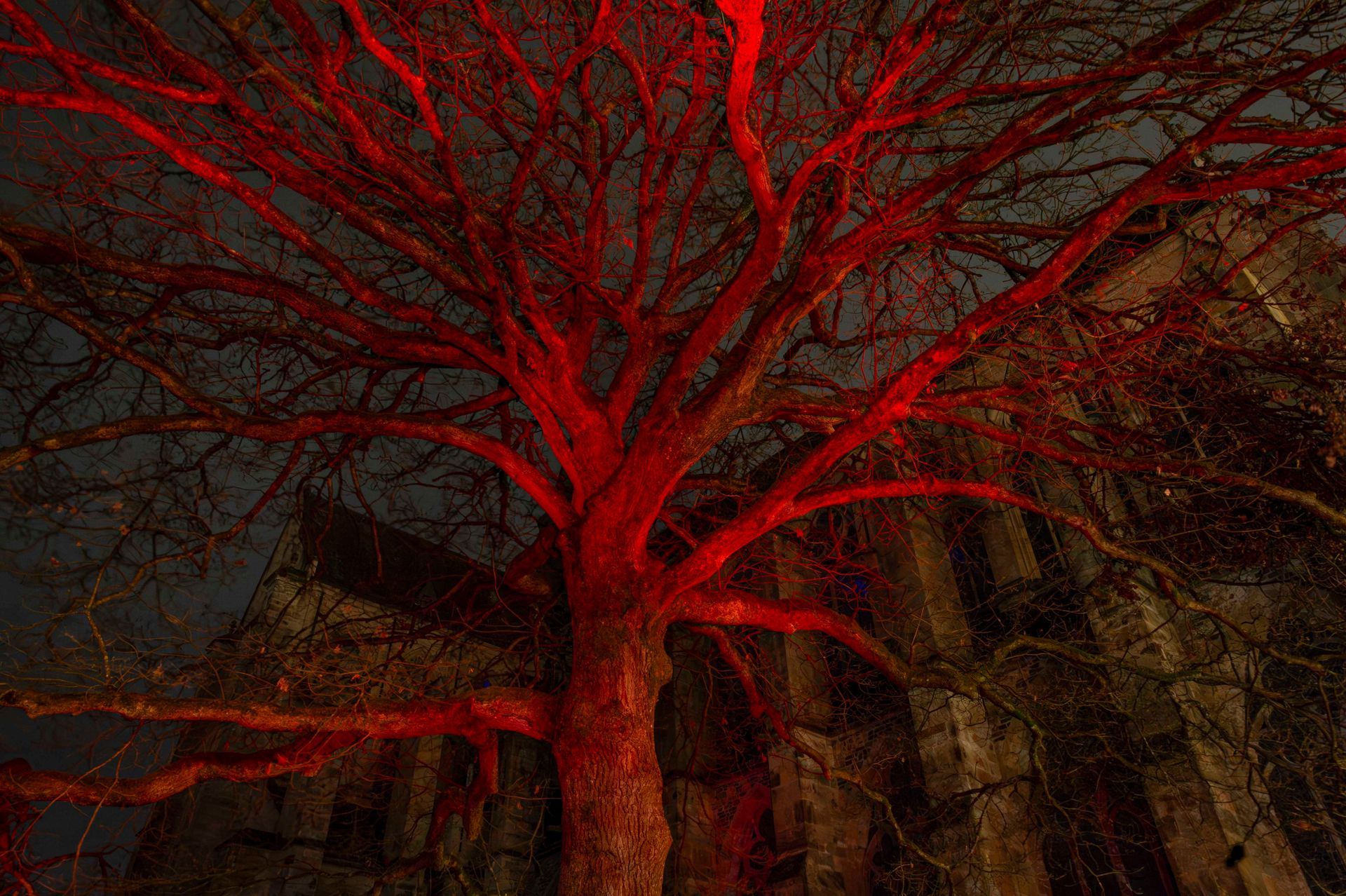 Mit einer kleinen roten Lichtquelle, geführt wie ein Pinsel über Oberflächen und Strukturen.