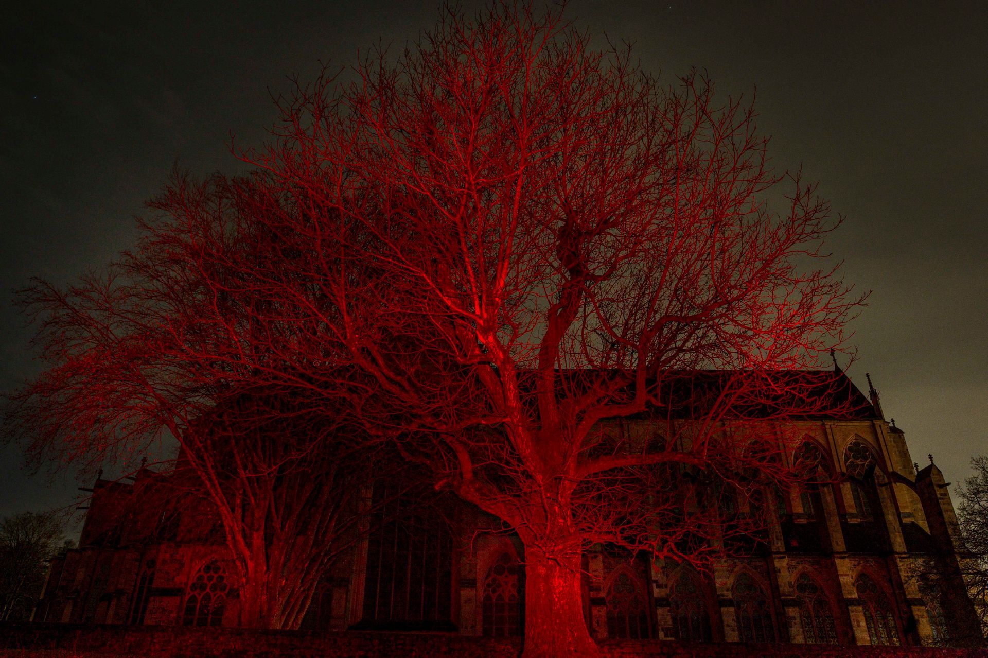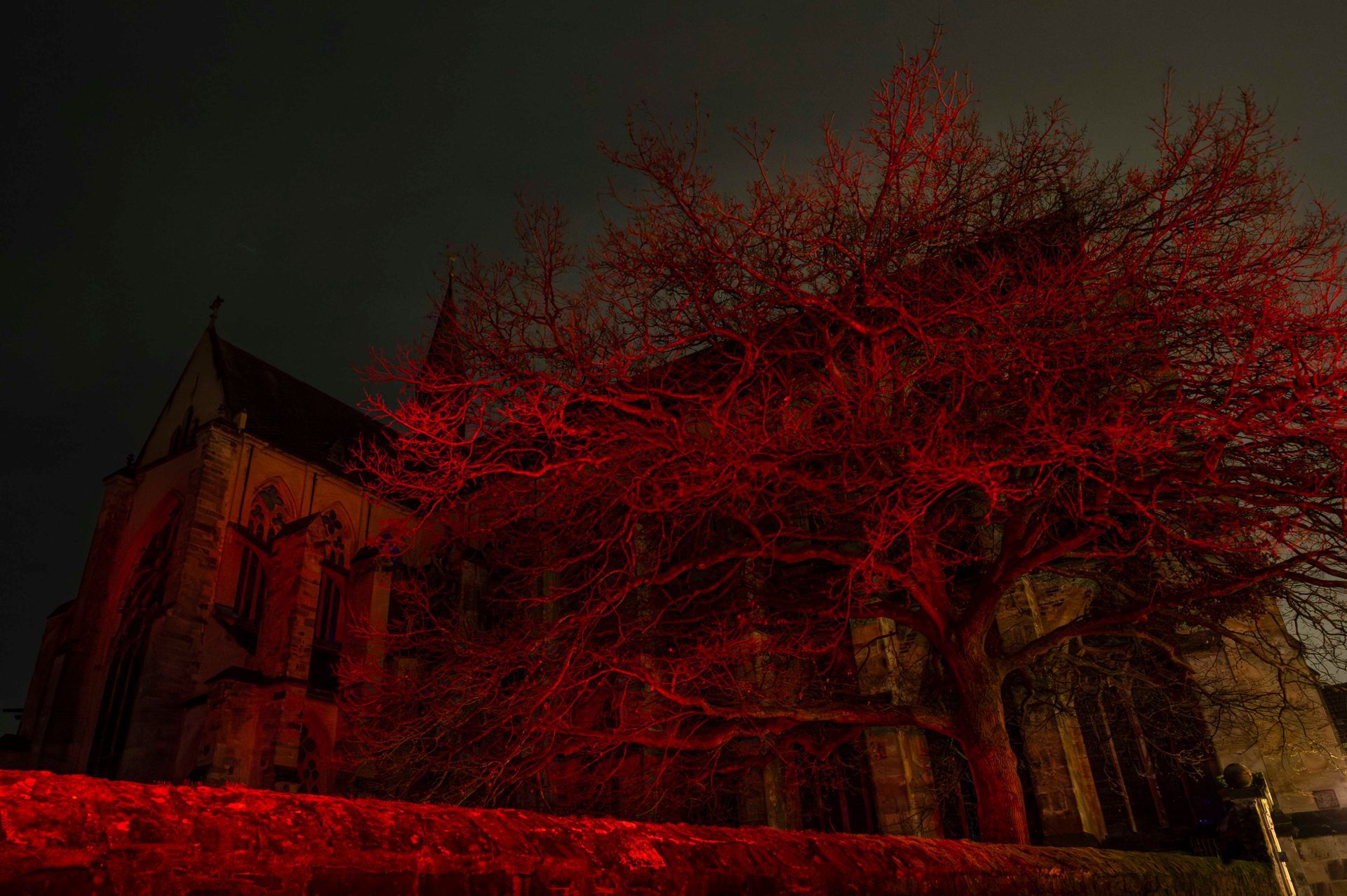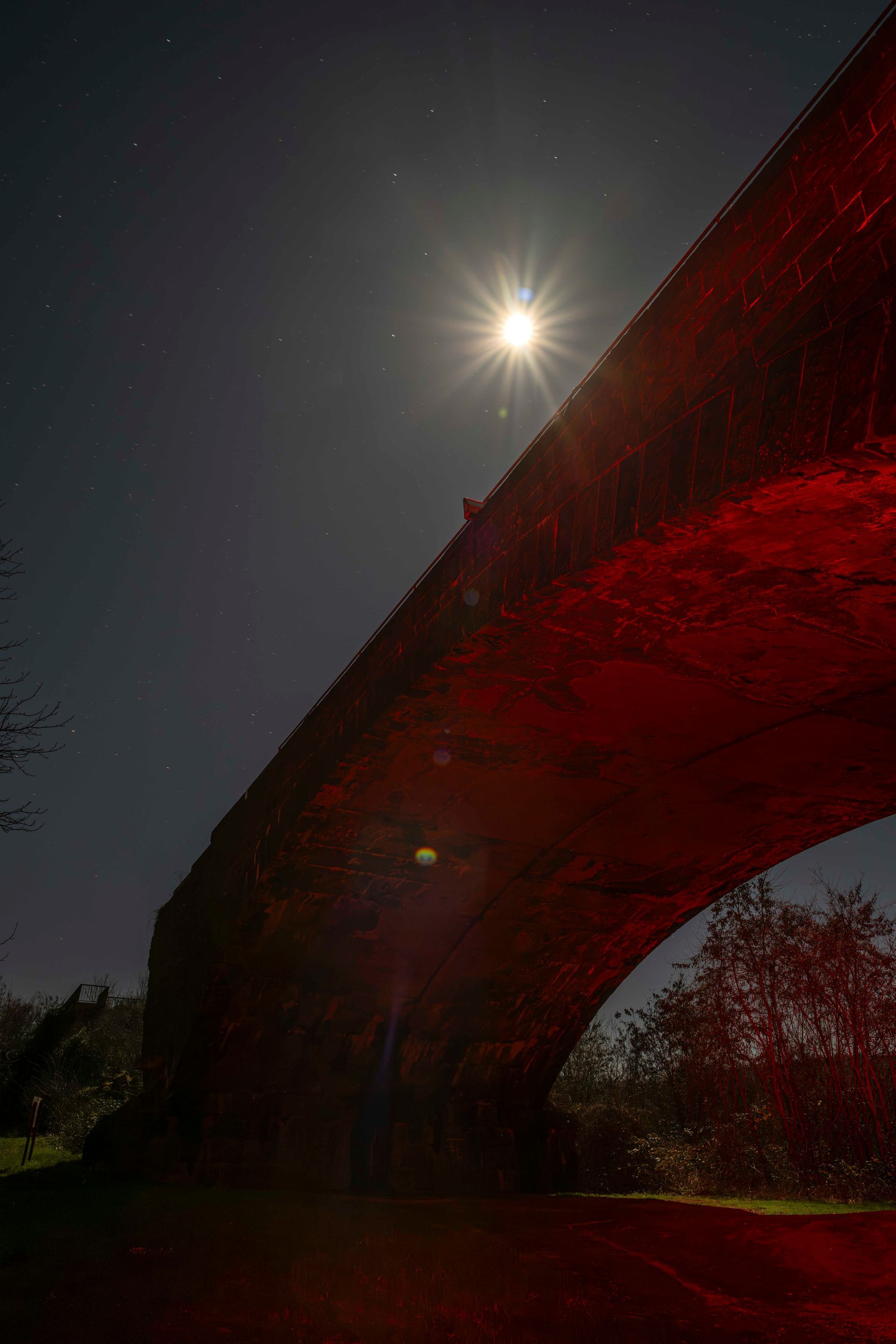 Mit einer kleinen roten Lichtquelle, geführt wie ein Pinsel über Oberflächen und Strukturen.